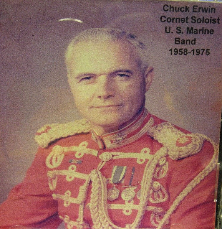 Chuck Erwin was one of the great cornetists who went directly from high school in Indiana straight into the Marine Band as cornet soloist and later as assistant director. After retirement, he had a big band in Washington, D.C. and was always in demand. (Personal interview).